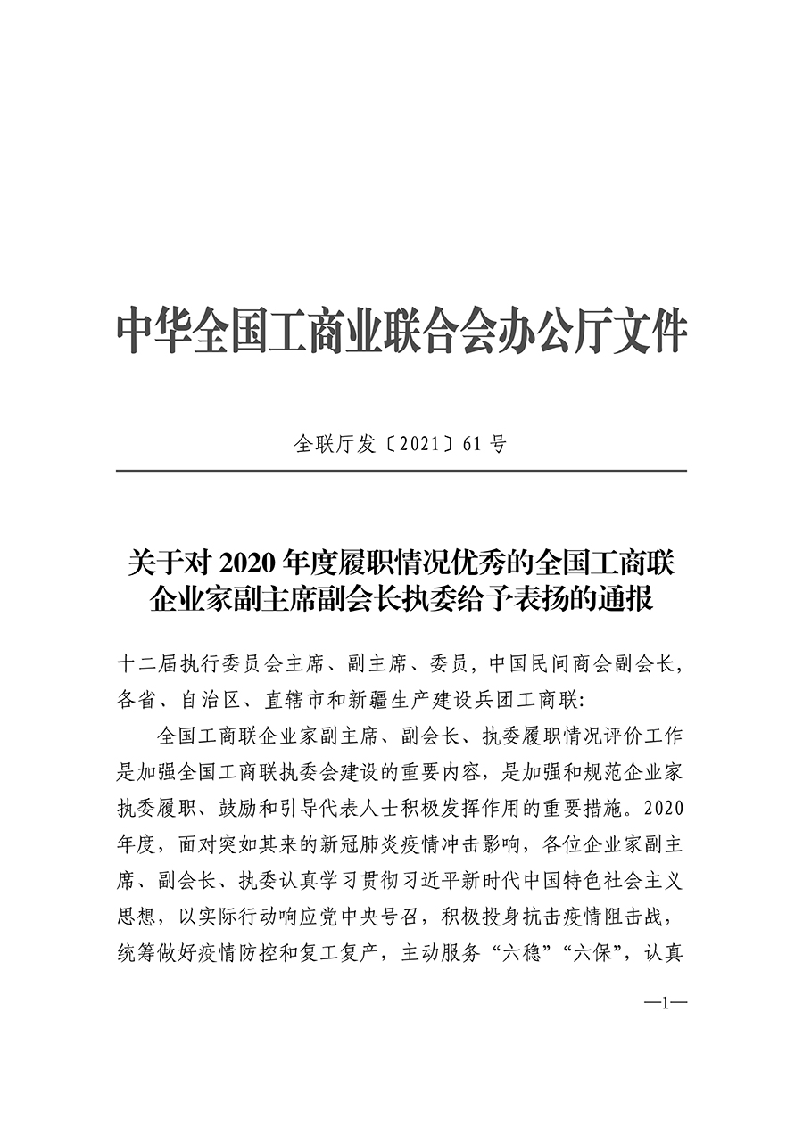 近日,全国工商联发布《关于对2020年度履职情况优秀的全国工商联企业家副主席副会长执委给予表扬的通报》。《通报》指出,2020年度面对突如其来的新冠肺炎疫情冲击影响,各位企业家副主席、副会长、执委认真学习贯彻习近平新时代中国特色社会主义思想,以实际行动响应中央号召,积极投身抗击疫情狙击战,统筹做好疫情防控和复工复产,主要服务“六稳”“六保”,认真贯彻新发展理念,积极参与构建新发展格局,持续参与“万企帮万村”行动,为取得抗击新冠肺炎疫情斗争重大胜利、如期取得脱贫攻坚战全面胜利、推动高质量发展作出了积极贡献。按照《关于做好2020年度全国工商联企业家副主席副会长执委履职情况评价工作的通知》要求,全国工商联对企业家、副主席、副会长、执委2020年度履职情况开展了评价工作。经全国工商联主席办公室会议、党组会议审议,决定对叶青等6名企业家副主席、副会长,丁佐宏等77名企业家执委予以通报表扬。