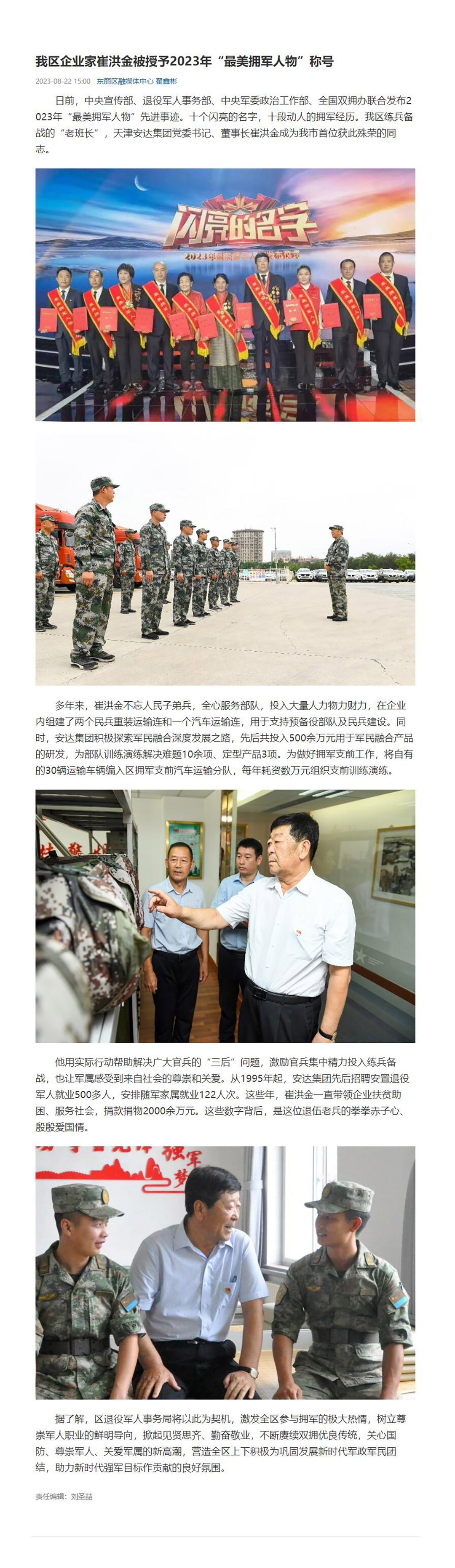 崔洪金董事长被授予2023年“最美拥军人物称号”