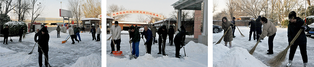12月14日,降雪覆盖了津城大地。翩然而至的冬雪为城市平添了几分浪漫与诗意,雪景虽美,但也为人们的出行和工作带来诸多不便。为保障员工们安全出行,15日一大早,安达集团本部及各子公司厂院内,各单位员工在相关领导带领下,手拿铁锹、扫帚、簸箕等工具,对办公楼门口和厂区内重要点位进行积雪大清扫。在袭袭寒风中,大家顶风除雪,不畏严寒,“浴”雪奋战,一派热火朝天的景象。